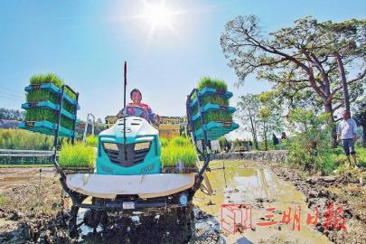 4月19日,清流縣里田鄉田坪村,剛剛整理過的水田中,農機手在駕駛插秧機插秧。據介紹,機械化插秧機每天可以插秧近50畝,是人工插秧的30倍,而且插秧機可以量化調節基本苗、栽插深度、株距等指標,大大提高水稻種植效率。目前,清流縣已有5.2萬畝農田像這樣使用機械化插秧。 (林文斌 楊 穎 巫建輝 攝影報道) |