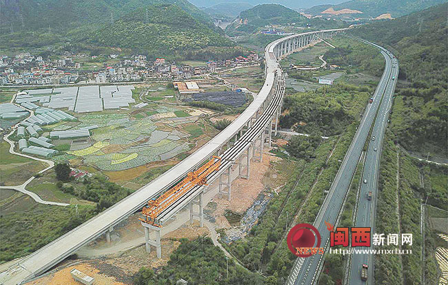 全長1620米的京源口特大橋,是廈蓉高速公路擴建工程漳州天寶到上杭蛟洋段最長的橋梁之一,經過兩年多施工,最后一根T梁于昨日架設成功,大橋全面貫通,為今年廈蓉高速擴建工程全線通車奠定基礎。圖為昨日該大橋最后一跨T梁施工全景。 記者 傅長盛 攝