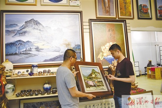 繪峰藝術(shù)畫廊主人向客戶介紹作品。