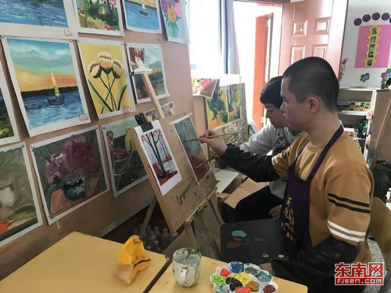 自閉癥學生和家長一起繪畫。 福建日報記者 莊嚴 通訊員 李加進 攝 東南網12月17日訊(福建日報記者 莊嚴 通訊員 李加進 文/圖) 日前,“心連心,融合發展”愛心義賣活動在寧德市蕉城區舉行,50多幅自閉癥兒童獨立完成的畫作讓眾多市民駐足驚嘆。 自閉癥患者也被稱為“星星的孩子”,他們缺乏情感反應、存在語言發育障礙等,終生無法治愈,而患兒的背后往往是痛苦而無助、需要終生奉獻的家庭。據統計,在中國的自閉癥人群超過1300萬,全球已經達到6700萬,新生兒比例1/120。 如何幫助他們?社會各界進行著長期而堅韌的探索。而在寧德市蕉城區,有了可喜的進展。 學校的思辨 寧德市蕉城區特殊教育學校坐落于寧德靈溪戚繼光公園腳下,環境優美、設施齊全,是一所集學前教育、九年義務教育和職業技術教育于一體,兼收智力殘障、自閉癥兒童少年,為他們提供免費教育的公辦學校。 近幾年,自閉癥兒童的數量呈上升趨勢,蕉城區特殊教育學校此類別的學生生源比例也在逐年增高,已達62名。自閉兒接受九年義務教育后,絕大多數人無一技之長,沒有單位和企業愿意接收,大齡自閉癥患者社會勞動就業基本空白,大多數患者只能被“關”在家中。如何為自閉癥患者尋求康復教育的“良方”,成為所有培智類學校面臨的老大難問題。 蕉城區特殊教育學校校長黃淺引介紹,自閉癥兒童大多數智力正常,有的在音樂、美術、計算等方面有突出天賦。畫畫是有色彩的,繽紛的色彩能給他們一片承載自我的天地,也可以成為他們情感輸出甚至互動的一種方式。 為了讓自閉癥患者走上自立之路,蕉城區特殊教育學校通過探索與調研,根據學校實際開發特色課程,以康復調理、藝術興趣兩種形式組織教學,開設職業高中班的油畫等藝術課程。 黃淺引說:“繪畫能培養自閉癥兒童的專注力,鍛煉他們的手眼協調以及辨別顏色等方面的能力。這對于自閉癥兒童來說,也是一種康復技能學習。” 蕉城區特殊教育學校發現,每一次畫畫,隨班就讀的母親就把孩子叫到身邊,耐心囑咐哪些地方需要改進,并加以鼓勵。在場的指導老師陳存忠說:“自閉癥孩子學習技能,常常要花數倍于正常孩子的時間,還需要家人的鼎力支持。” 陳然(化名)是該校職業高中班的一員。這個兩周歲時被診斷為自閉癥的男生,如今已經成長為一個不愛說話但多才多藝的青年,2017年還獲得了全國殘障少年兒童繪畫大賽二等獎。 隨班就讀的陳然(化名)的母親陳賽鳳,每天到學校關顧孩子,自己也學會了畫畫。她告訴記者,孩子的畫看起來很亂,但是亂中又有它的規律。他的畫看起來沒有什么特別,但仔細挖掘又有特別的地方,已被北京的一些大學教授收藏,被意大利、法國的一些畫展收藏,甚至作為國禮送給外國人。 目前,該校正在探索自閉癥孩子與家長共同學習、共同創業的平臺。在孩子學畫畫的同時,讓家長也學會畫畫。