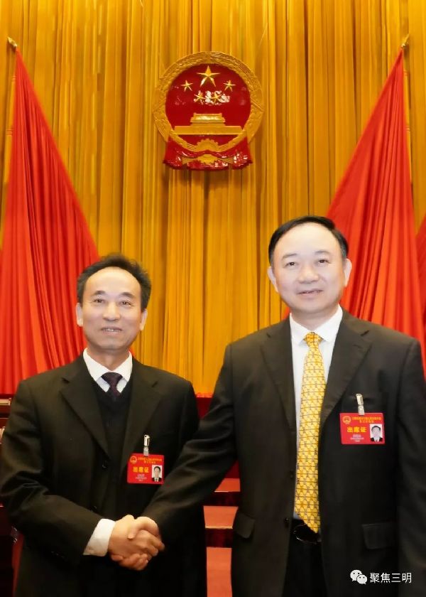 △圖為省政協(xié)副主席、市委書記杜源生與新當選的市人大常委會主任詹積富親切握手,表示祝賀。(三明日報記者 周志鴻 攝)