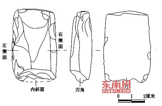 長泰文廟(石崗山)采集到的石錛 該石錛為淺灰色火山巖,風化中等。平面長方形,橫剖面梯形,平頂,弧刃。石錛兩面加工,腹面遍布修疤痕,背面修疤僅限于兩側,形成兩個向內傾斜的側面,刃部兩面經過磨制,內斜面與修疤有明顯分界,上緣線略呈圓弧形。背面磨制光滑,刃部因使用而有崩片。長5.4、頂寬2.7、刃寬2.8、最厚1.6厘米。 發現這件石錛后,該考古專業人員非常興奮,于是就邀請自己的大學老師,石器研究專家、廈門大學歷史系蔡保全教授進行鑒定。經過鑒定,該文物系浮濱文化的典型器物弓背石錛。而浮濱文化是中原王朝紀年商朝時期閩南、粵東古人類創造的文化,年代距今約3500-3000年。
