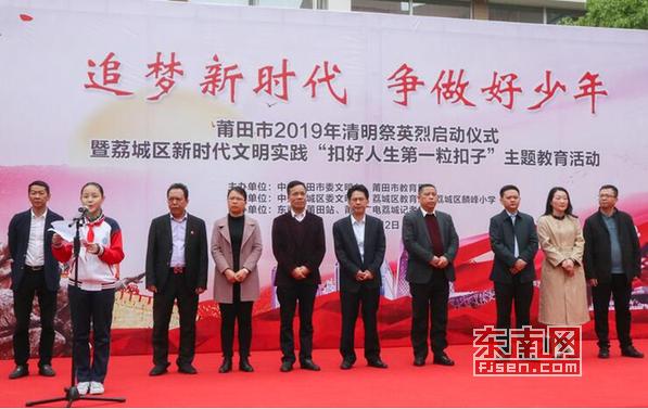 學生代表宣讀倡議書 東南網莆田4月3日訊(本網記者 吳炳端 見習記者 許子霄 文/攝)4月2日上午,“追夢新時代,爭做好少年”莆田市2019年清明祭英烈活動啟動儀式暨荔城區新時代文明實踐“扣好人生第一粒扣子”主題教育活動在麟峰小學舉行。 荔城區委常委、宣傳部長吳金鵬在活動中表示,“清明祭英烈”活動是中央文明辦開展的“傳承紅色基因”系列教育活動的一項重要內容,是中央、省委推動新時代精神文明建設的新舉措。全區各學校要高度重視,扎實開展青少年“扣好人生第一粒扣子”主題教育實踐活動。一要深挖傳統節日內涵,運用民族重要傳統節日文化內涵加強未成年人思想道德建設,與愛國主義教育以及文明校園創建活動有機結合;二要弘揚祭祀文明新風,倡導“網絡祭掃”“鮮花祭祀”,通過獻花、詩賦、祭文、植樹等文明環保的祭掃形式寄托哀思,反對鋪張浪費、奢侈揮霍,使清明節成為傳統文化與現代文明相融合的節日;三要豐富活動開展形式,開展好“網上祭英烈”簽名寄語活動,同時通過征文演講、詩歌朗誦、瞻仰革命烈士陵園、參觀愛國主義教育基地等形式,引導未成年人學習黨史、國史和英模事跡,增強愛國情感;四是有效推動文明實踐,各學校以學校師生為主體,建立一支農村或社區教育志愿服務隊伍,開展以紅色旅游、經典誦讀、禮儀傳習、民俗體驗、勞動技能培訓等親子夏令營活動,引導青少年弘揚民族優秀傳統文化,為廣大青少年“扣好人生第一粒扣子”打下堅實基礎。