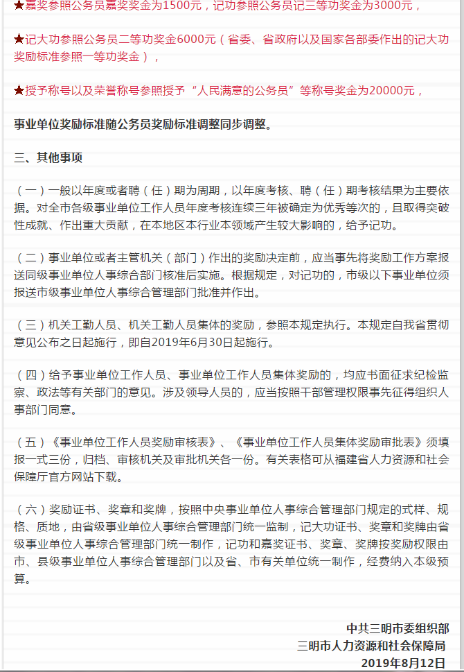 中共三明市委組織部、三明市人力資源和社會保障局近日發(fā)布通知,對事業(yè)單位工作人員定期獎勵的周期和比例、一次性獎金的標準等做出規(guī)定。 ★定期獎勵的比例(名額),由獎勵決定單位結(jié)合事業(yè)單位數(shù)量、人員規(guī)模、職責(zé)任務(wù)、工作績效等因素統(tǒng)籌確定。 ★事業(yè)單位工作人員獎勵標準參照《中共中央組織部辦公廳人力資源社會保障部辦公廳 財政部辦公廳國家公務(wù)員局綜合司關(guān)于調(diào)整公務(wù)員獎勵獎金標準的通知》(人社廳發(fā)〔2018〕1號)執(zhí)行,獎勵標準隨公務(wù)員獎勵標準調(diào)整同步調(diào)整。 通知全文如下: ![]() ![]() |