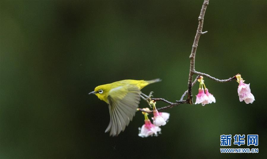一只繡眼鳥在福州國家森林公園內的櫻花枝頭飛舞(1月18日攝)。 近日,福建省福州市多家公園相繼開放的櫻花,吸引不少小鳥嬉戲飛舞,成為冬季榕城的一道風景。 新華社記者 梅永存 攝