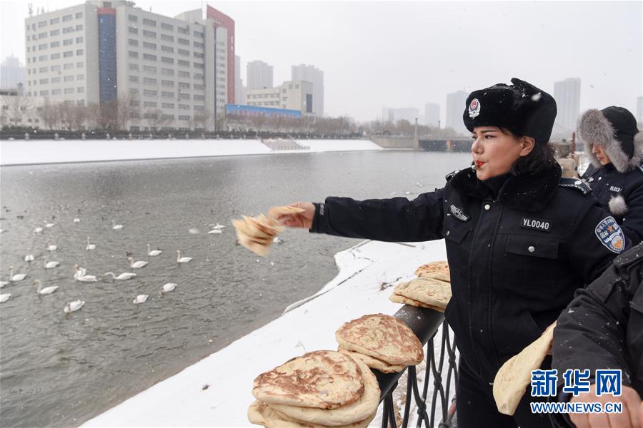 庫爾勒市園林綠化管理局園林監察大隊天鵝中隊隊員為天鵝投喂食物(1月18日攝)。 新華社記者 丁磊 攝