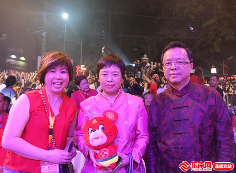 中國駐菲律賓大使黃溪連(右)與夫人曹軼群(中)攜東南網(wǎng)鼠年公仔向大家拜年!