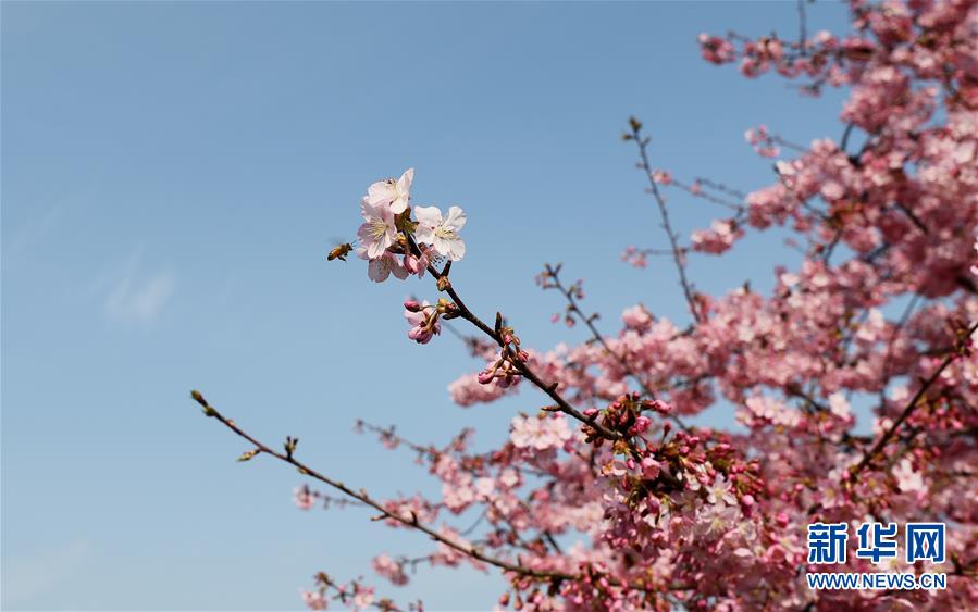 2月24日,在上海松江辰山植物園,蜜蜂在河津櫻櫻花叢中飛舞。 近日,上海松江區辰山植物園內的河津櫻絢麗綻放,花團錦簇間一派盎然春意。 新華社記者 方喆 攝