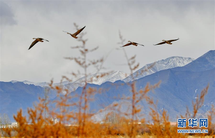 斑頭雁在拉魯濕地上空飛翔(2月24日攝)。 初春的拉薩,氣溫回升,拉魯濕地國家級自然保護區冰雪消融、百鳥飛舞。位于拉薩市西北的拉魯濕地國家級自然保護區海拔3645米,濕地保護面積近13平方公里,被譽為“拉薩之肺”。 新華社記者 張汝鋒 攝