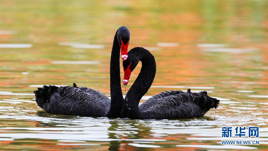 這是3月17日在福州市牛崗山公園拍攝的一對黑天鵝。 新華社記者梅永存攝