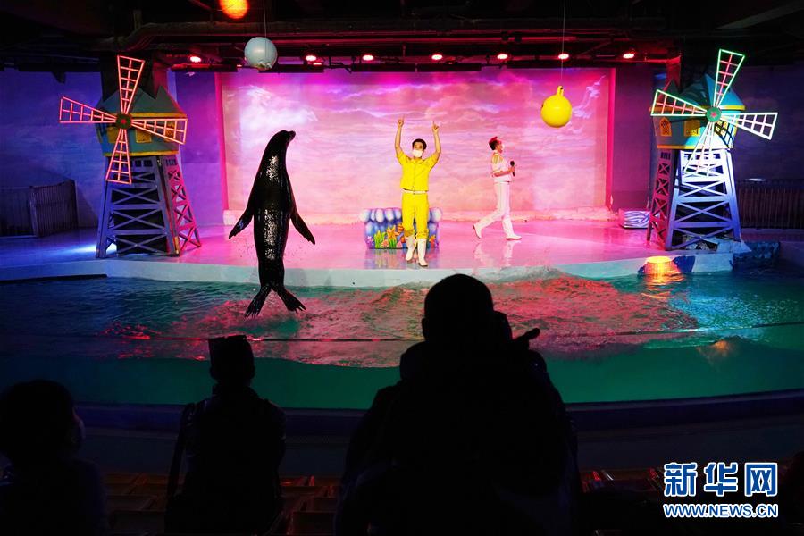 3月23日,游客在哈爾濱極地館觀看海獅表演。 當日,哈爾濱極地館恢復營業。目前,極地館日接待人數不超過400人,園區采取分時段、間隔性辦法安排游客有序入園。游客實名預訂門票,入園要配合測溫、佩戴口罩、掃描“龍江健康碼”,刷身份證入館。 新華社記者 王建威 攝