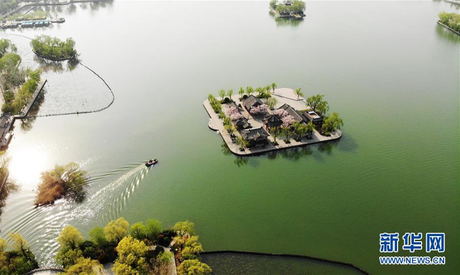3月23日拍攝的濟南大明湖春光(無人機照片)。 正值春暖花開的季節(jié),山東濟南大明湖畔綠意盎然,景色宜人。 新華社記者 王凱 攝