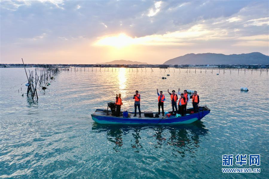 3月26日,福建漳州東山縣岐下村村民陳炎松(左一)駕駛著小舢板載著客人返回碼頭(無人機照片)。新華社記者 姜克紅 攝
