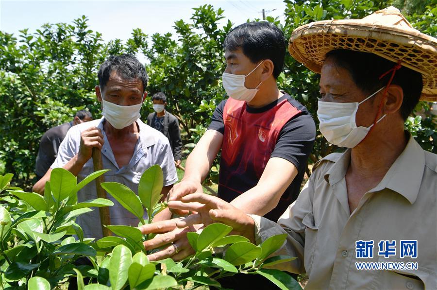 4月28日,在莆田市仙游縣龍華鎮貂峰村天山湖農場文旦柚扶貧產業基地,精準扶貧戶吳國珍(前左一)在學習文旦柚的栽培修剪技術,他在產業基地打工,每月保底工資1500元,2018年已脫貧。新華社記者 魏培全 攝