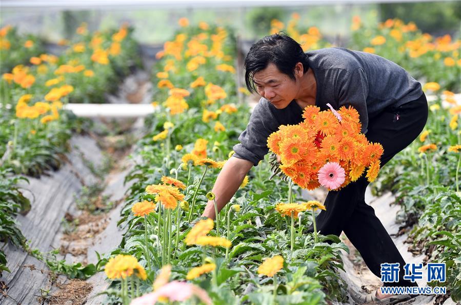 5月6日,在連城縣林坊鎮林塘村,脫貧農戶林漢生在扶貧大棚采摘鮮切花。 近年來,福建省連城縣依托當地扶貧大棚、家庭農場等扶貧農業基地,實施激勵性特色農業產業扶貧項目,統籌種苗提供、農資保障、技術指導及產品銷售,激發脫貧農戶創業動力。2019年以來,連城縣先后實施激勵性產業扶貧項目271個,帶動當地4255戶農民拓寬增收渠道,穩定脫貧。 新華社記者 彭張青 攝