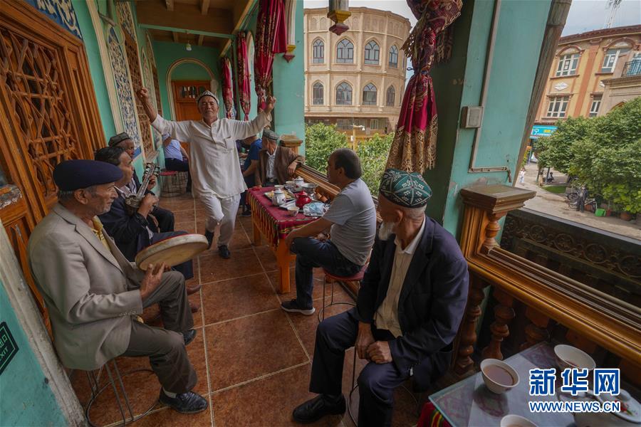 在新疆喀什古城景區內的百年老茶館陽臺上,當地居民在跳舞、聊天(5月17日攝)。 入夏以來,新疆喀什古城景區在做好疫情防控的同時,不斷優化景區旅游環境、提升服務質量,為各地游客提供更好的旅游體驗。 新華社記者 趙戈 攝