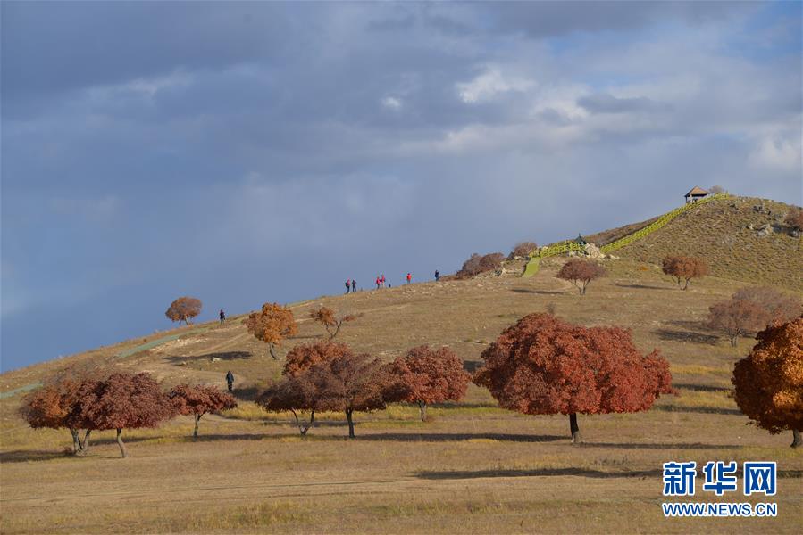 10月12日,游客在五角楓生態旅游景區游玩。 金秋時節,內蒙古興安盟科爾沁右翼中旗五角楓生態旅游景區的五角楓迎來最佳觀賞期,棵棵楓樹點綴了秋日草原,美景如畫。 新華社記者 葉紫嫣 攝