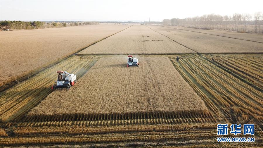 10月15日,收割機(jī)在黑龍江省紅衛(wèi)農(nóng)場(chǎng)的田間收獲水稻(無(wú)人機(jī)照片)。 時(shí)下正值“北大倉(cāng)”黑龍江省的秋收季,在墾區(qū)的各水稻種植區(qū),收割機(jī)械在田間忙碌收獲。 新華社記者 王建威 攝