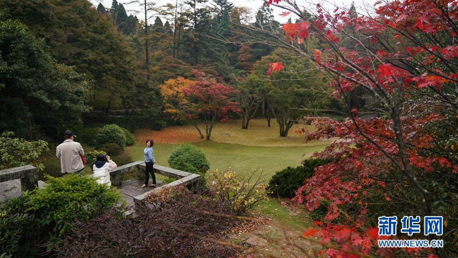 10月17日,游客在廬山風(fēng)景區(qū)的植物園內(nèi)拍照。 近日,位于江西省九江市的廬山風(fēng)景區(qū)云霧繚繞,層林盡染,許多游客前來賞秋。 新華社記者 胡晨歡 攝