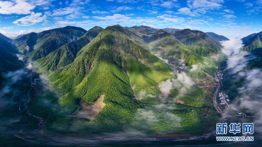 12月1日,武夷斷裂帶峽谷內云霧繚繞,村莊若隱若現(無人機照片)。