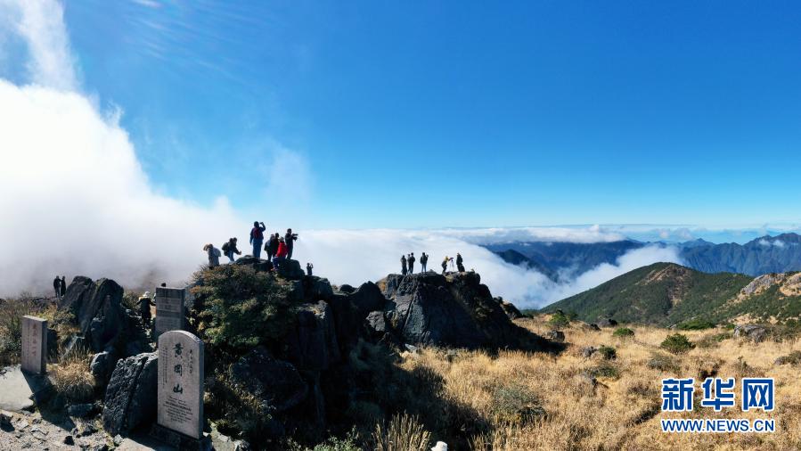 12月1日,人們在云霧繚繞的武夷主峰黃崗山頂參觀(無人機照片)。