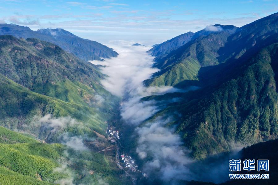 12月1日,武夷斷裂帶峽谷內云霧繚繞,村莊若隱若現(xiàn)(無人機照片)。