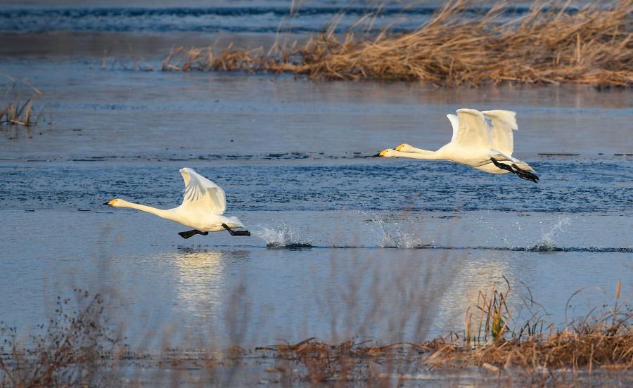 12月6日,天鵝在北京懷柔水庫準(zhǔn)備起飛。