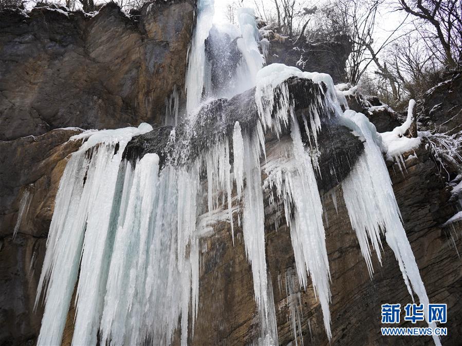 這是官鵝溝內的一處冰瀑(12月16日攝)。 連日來,持續低溫讓位于甘肅省隴南市宕昌縣境內的官鵝溝國家森林公園銀裝素裹,景區內群山湖泊被冰雪覆蓋,一道道冰瀑高掛懸崖,宛若一幅美麗畫卷。 新華社記者 郎兵兵 攝