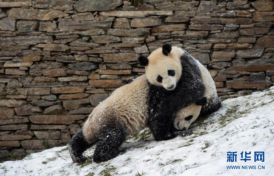 12月17日,大熊貓在中國大熊貓保護研究中心臥龍神樹坪基地的雪地里嬉戲。