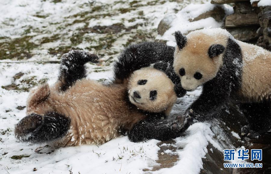 12月17日,大熊貓?jiān)谥袊笮茇埍Wo(hù)研究中心臥龍神樹坪基地的雪地里嬉戲。