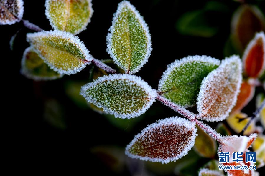 當日清晨,受冷空氣影響,上海街頭的一些植物葉片凝上了霜,分外美麗。