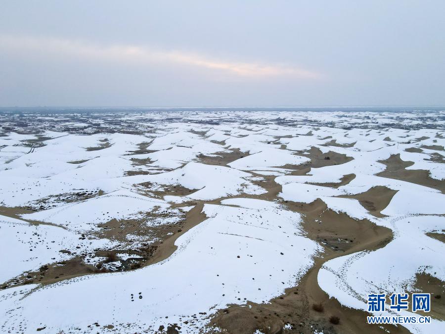 在新疆岳普湖縣達瓦昆沙漠旅游風景區內,塔克拉瑪干沙漠在皚皚白雪映襯下更添秀色,黃沙與白雪相映成趣,景色如畫。