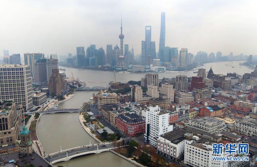 12月29日,從空中俯瞰蘇州河(下)與黃浦江的交匯處(無人機照片)。