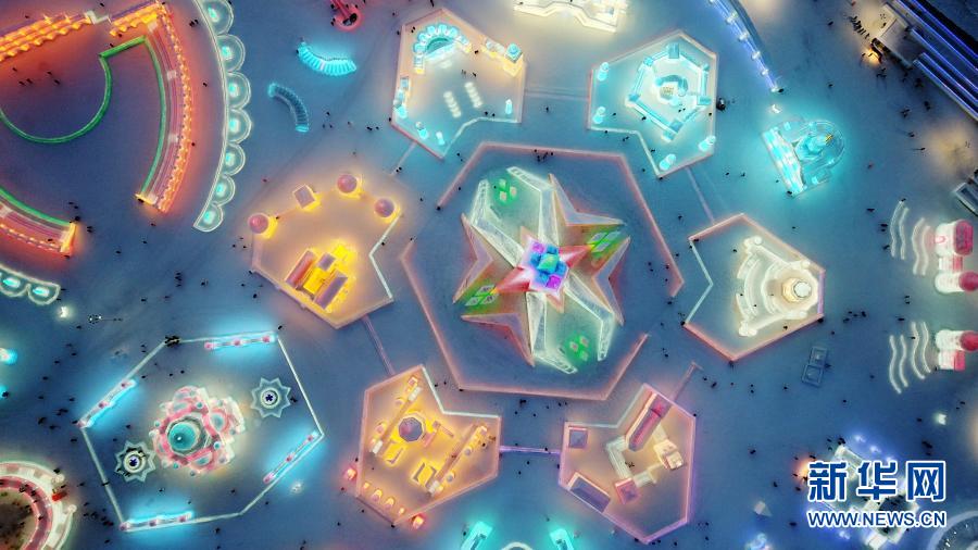 這是2021年1月4日拍攝的哈爾濱冰雪大世界局部(無人機照片)。