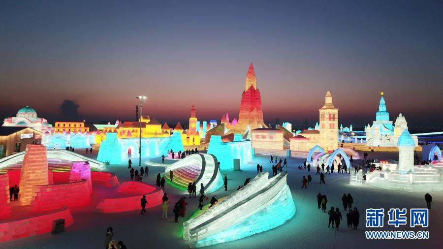 這是2021年1月4日拍攝的哈爾濱冰雪大世界局部(無人機照片)。