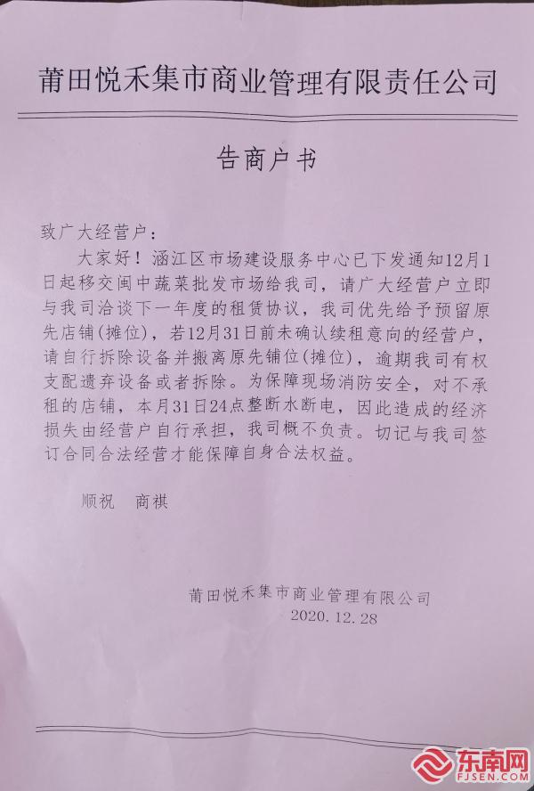 告商戶書(商戶供圖) 協商無果 漲租確實不合理 對于閩中蔬菜批發市場轉包給私企經營的問題,涵江區商務局函復東南網稱,經涵江區人民政府常務會議研究同意特許經營(含建設)一體化對外公開招標,該局嚴格按照招投程序辦理。經過公開招投標,由福建悅禾集市商業管理有限公司中標,獲得承包經營權,具體由其子公司莆田悅禾集市商業管理有限公司進行管理運營,并與該局下屬單位涵江區市場建設管理服務中心簽訂了《合作經營協議書》,明確從2021年1月1日起,閩中蔬菜批發市場整體移交給莆田悅禾集市商業管理有限公司接續經營管理。 “2020年11月之前,我們商戶完全不知情。”提及市場承包給私企是否征求過商戶意見時,鄭先生說,在涵江區市場建設管理中心發《通知》時,他們才知道該市場被承包。 對此,東南網記者致電采訪涵江區市場建設管理服務中心主任郭忠王。他表示,2020年4月,涵江區市場建設管理服務中心曾組織召開職工大會,共65人參加,56人同意市場轉包給私企經營。 “由于疫情影響,商戶的生意不好做,店鋪租金上漲超200%,我也覺得確實不合理。”郭忠王告訴記者,這次是把涵江區農貿市場和閩中蔬菜批發市場整體承包給福建悅禾集市商業管理有限公司,而涵江區農貿市場租金卻只上漲30%—40%。 據記者了解,目前,該市場的商戶對租金上漲意見很大。郭忠王說,涵江區市場建設管理服務中心負責人也曾多次與商戶協商,但無果。“因運營方和商戶的工作時間不一致,所以沒法組織雙方共同協商。”而對此,商戶均稱,此前沒有官方組織過協商。 郭忠王表示,下一步他們將繼續與運營方、商戶協商溝通,爭取盡早達成共識。 截至發稿前,記者了解到該市場運營商莆田悅禾集市商業管理有限公司還未對未承租的商戶斷水斷電。 東南網將繼續關注事件進展。 |