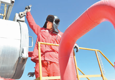 近期,中國石油天然氣集團公司青海油田分公司采氣一廠優化組織運行以及安全環保管控,為冬季供氣提供有力保障。圖為1月6日,該廠工作人員完成作業后擰上過濾器閥門。 新華社記者 張曼怡攝