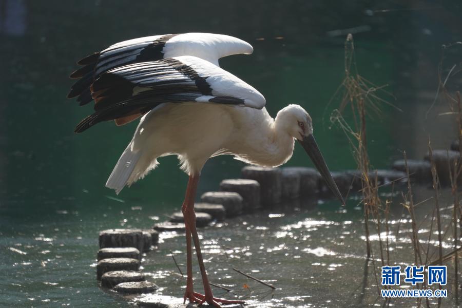 當日,江西省永修縣天氣晴好,在江西鄱陽湖國家級自然保護區管理局吳城保護管理站,兩只受傷后被送來醫治的東方白鸛享受冬日暖陽。