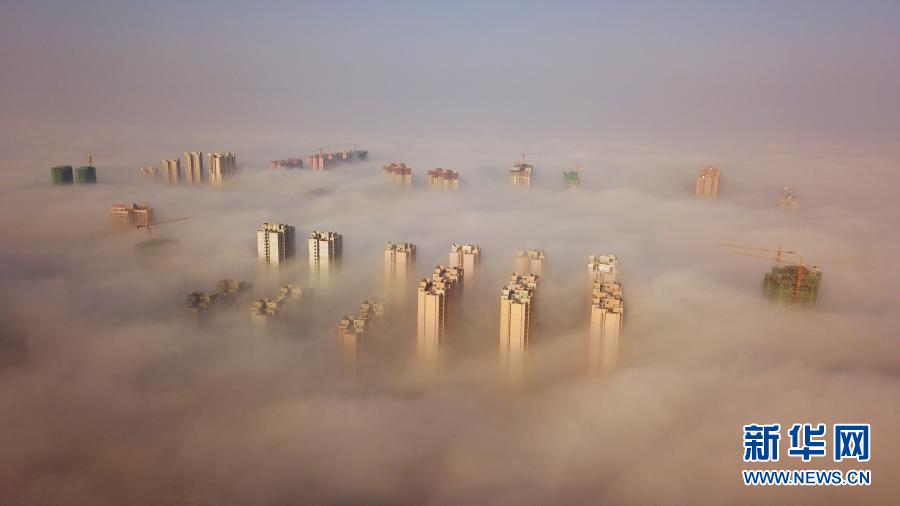 當日,素有“陽光城”美譽的貴州省威寧縣城出現平流霧天氣,近處的高樓和遠處的群山掩映在霧海中,時隱時現,美若畫卷。