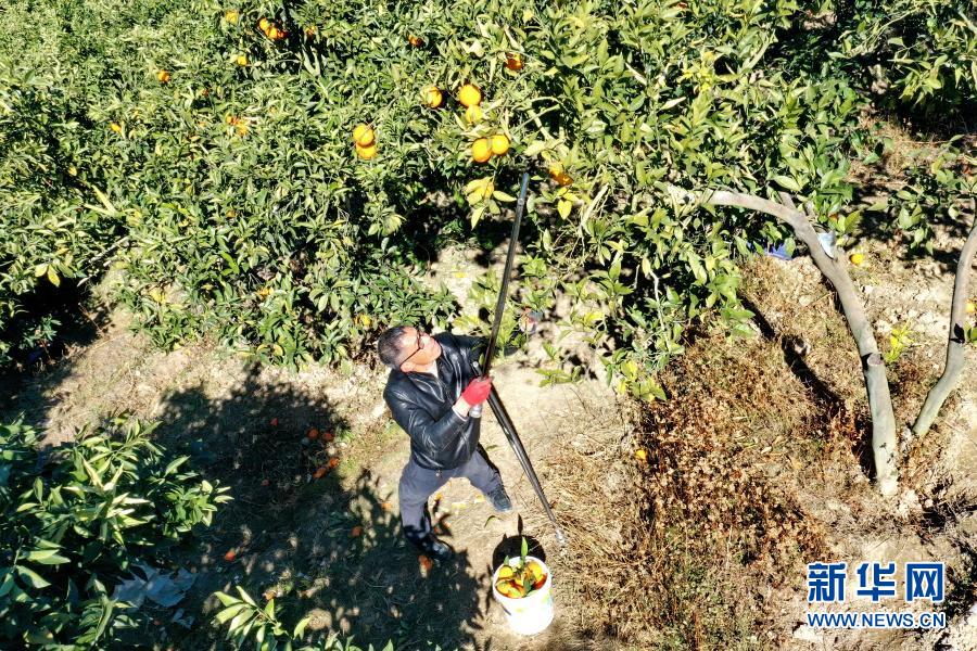1月13日,吳伯光用拐杖勾住樹枝采摘臍橙。新華社記者 林善傳 攝