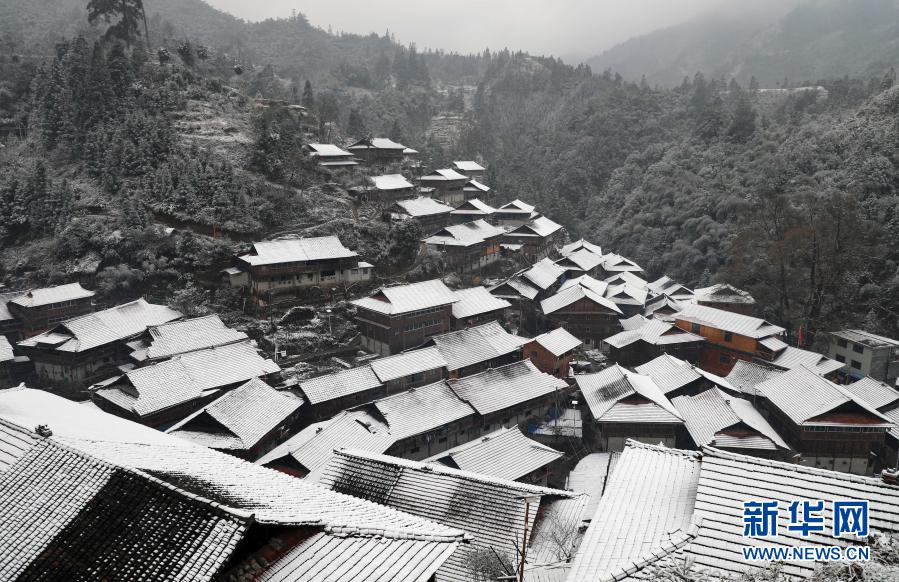 當日,受強冷空氣影響,廣西、貴州交界的多個苗寨迎來降雪。