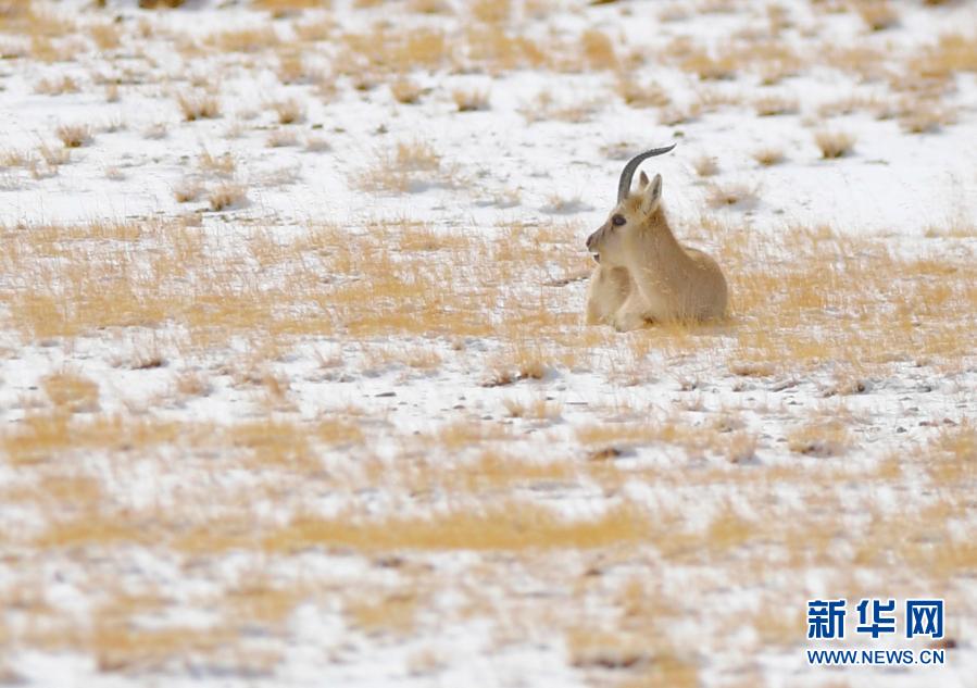 一只藏原羚在藏北高原的雪地上休憩(1月16日攝)。