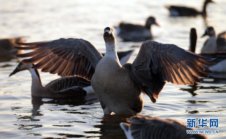 1月18日,在沈陽市渾河鳥島附近,大雁在水面上嬉戲。新華社記者 楊青 攝