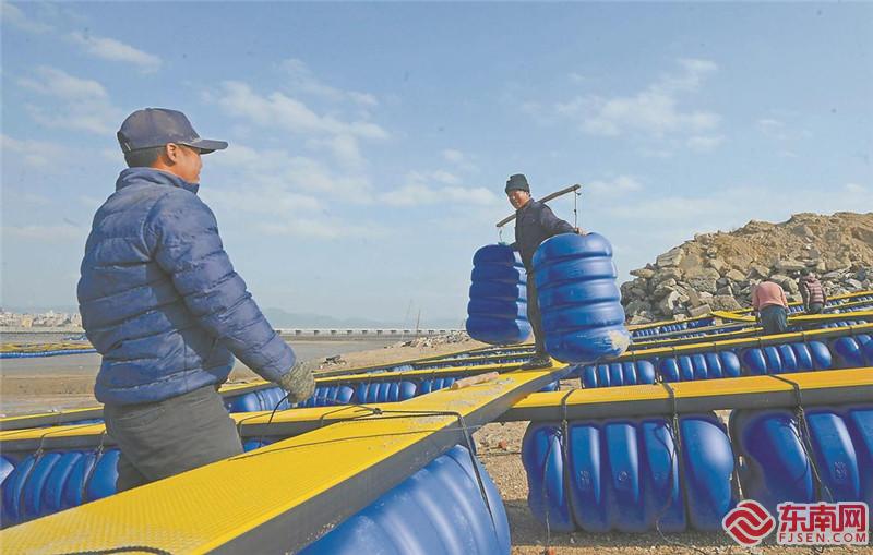 19日,在泉州南埔鎮肖厝惠嶼新型塑膠網箱安裝基地,工人在擔運環保塑料浮球。為加快推進泉港區水產養殖綠色發展,去年12月,該區投入5300多萬元,啟動肖厝惠嶼新型塑膠網箱升級改造項目,在海域面積22.1公頃的南埔淺海網箱養殖區,用新型塑膠養殖漁排替代傳統木質漁排,減少海漂垃圾。福建日報 林弘梫 攝影報道 |