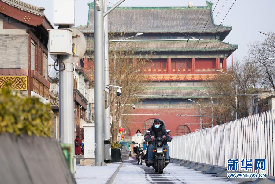 當日,受低層偏東風增濕和地形抬升的共同作用,北京出現降雪天氣。在北京市東城區,鐘鼓樓籠罩在彌散的雪花中,盡顯古都冬韻。