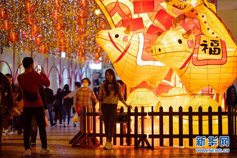 當晚,以“金牛獻瑞迎新春”為主題的春節(jié)彩燈在澳門街頭全面點亮,吸引不少市民和旅客前來感受年味。