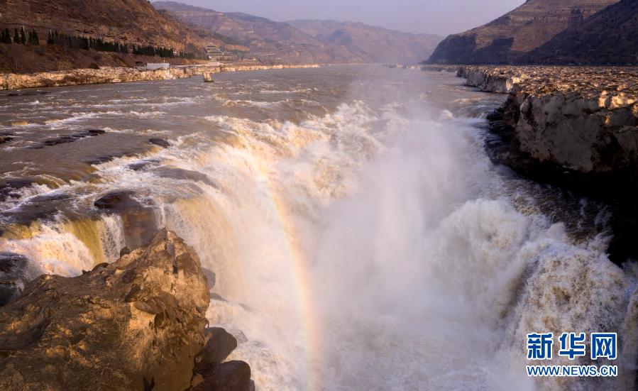 2月23日,壺口瀑布出現彩虹(無人機照片)。新華社記者陶明攝
