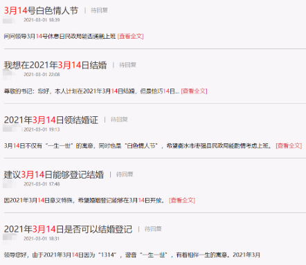 昨天(2日) #民政局拒絕3月14日加班建議# 沖上了熱搜 2021年3月14日 諧音“愛你愛一生一世” 不少婚期將近的網友 都希望能在這天與愛人領證 然而,今年的3月14日恰逢星期天,為國家規定的法定假日,并不在婚姻登記業務的開放時間內。 對此,有不少網友在各互聯網平臺留言,希望各地婚姻登記處能夠在3月14日臨時開放,實現新人們在當天領結婚證的意愿。
