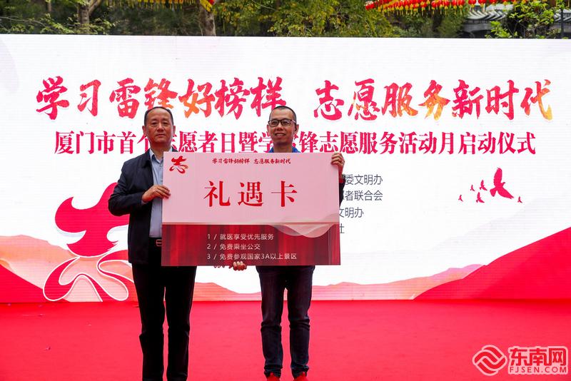 為志愿服務先進典型頒發“廈門市道德典范禮遇卡” (主辦方供圖) 見證廈門志愿服務事業多個“第一” 今年3月5日是第58個學雷鋒紀念日,也是廈門市首個志愿者日。去年12月,廈門市出臺《廈門經濟特區志愿服務條例》(以下簡稱《條例》),并將每年的3月5日定為廈門市志愿者日。從今年開始,廈門志愿者擁有了自己的“專屬節日”。 據了解,該《條例》是廈門市第一部關于志愿服務的專門性法規,全面規定了志愿服務的基本原則、行政管理、權益保障、激勵措施、法律責任。《條例》將于3月5日正式實施,標志著廈門市志愿服務事業站在新起點,進入新發展階段。 活動現場,志愿者王世偉作為代表接過了首張“廈門市道德典范禮遇卡”。這是一份屬于歷屆全國、省志愿服務先進典型代表的“特殊禮物”,由廈門市委文明辦協調市直相關部門共同推出。持卡人可憑此在廈門享受免費乘坐公交、地鐵等公共交通工具,免費參觀游覽3A級以上景區景點,并在各級公立醫療衛生機構就醫時,優先享受醫療服務等禮遇。 記者還從現場獲悉,廈門金榜公園成為全市第一個志愿服務公園。