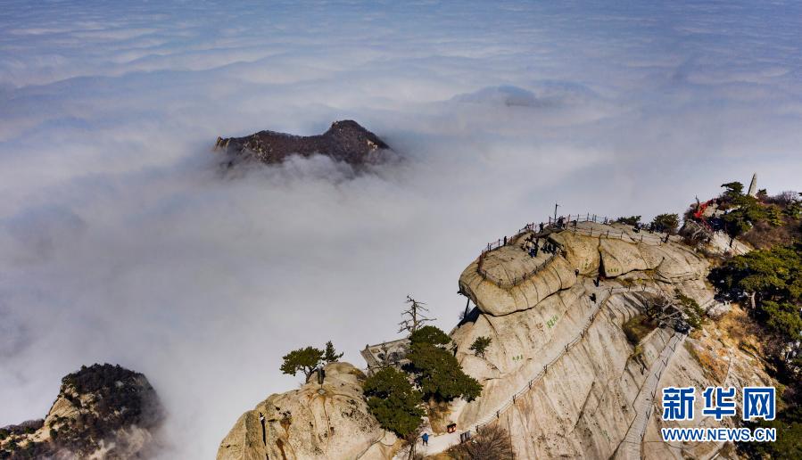 3月9日,游人在華山西峰游覽(無(wú)人機(jī)照片)。